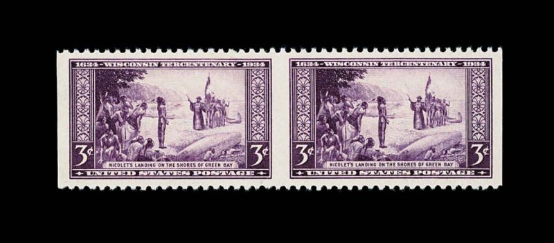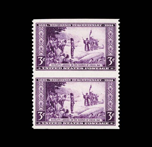884 nh 739b image#739b, 3c Wisconsin Tercentenary, horizontal pair, imperforate vertically, a highly select example of this rare error, possessing mathematically precise centering within extravagantly large margins, pristine o.g., n.h., extremely fine; certainly one of the finest known of the approximately 80 pairs thought to exist; 1991 PF certificate for a block of four, this being the bottom pair. (Image) 750.00