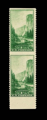 885 og 740a image#740a, 1c Green National Parks, vertical pair, imperforate horizontally, bottom sheet-margin example of this rare error pair, of which only sixteen pairs or strips of three exist, well centered, o.g., lightly hinged, very fine; terribly undercataloged in Scott considering how few genuine error pairs exist, in fact the current edition of the Datz error catalog prices this pair at $1,750.00; signed "S.A." (Spencer Anderson) as are all known genuine errors, also accompanied by a 1986 PF certificate. (Image) 450.00