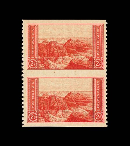 886 nh 741a image#741a, 2c Red National Parks, vertical pair, imperforate horizontally, pristine mint example of this elusive error, with only two or three error panes known, well centered, o.g., n.h., choice very fine; 1994 PF certificate. (Image) 600.00