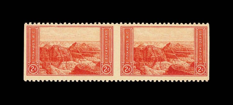 887 nh 741b image#741b, 2c Red National Parks, horizontal pair, imperforate vertically, wonderfully fresh and choice example, well centered, o.g., n.h., very fine; only two or three error panes are thought to have been discovered; 1994 PF certificate. (Image) 750.00
