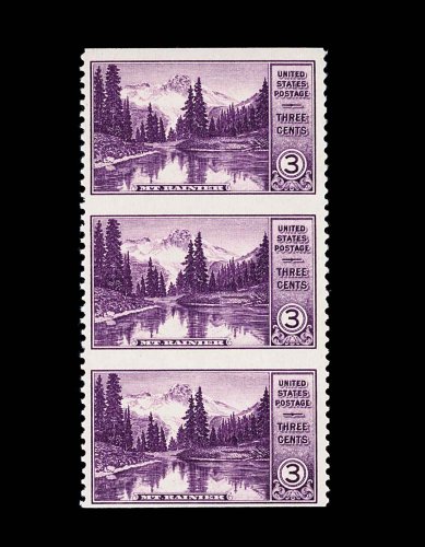888 nh 742a image#742a, 3c Deep violet National Parks, vertical strip of three, imperforate horizontally, quite fresh, top pair especially well centered and margined, o.g., n.h., natural gum skips on third stamp, extremely fine; only one error pane of 50 stamps was ever found; 1985 PF certificate. (Image) as a pair 575.00