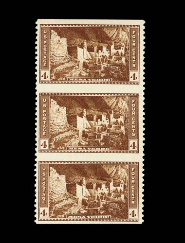 889 nh 743a image#743a, 4c Brown National Parks, vertical strip of three, imperforate horizontally, a premium quality example of this very rare error, of which only fifteen pairs are known and, according to the Datz catalog, six to nine of the existing pairs have brown paper adhering to the reverse, the strip offered here is one of the very few known examples without the paper adherence, quite fresh, well centered, o.g., n.h., very fine; 1985 PF certificate. (Image) as a pair 1,000.00