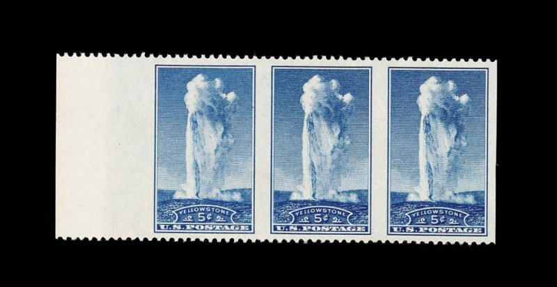 890 nh 744a image#744a, 5c Blue National Parks, horizontal strip of three, imperforate vertically, a choice left sheet-margin strip of three, extraordinarily well centered and margined, brilliantly fresh, o.g., n.h., extremely fine; only two error sheets were ever found; 1986 PF certificate. (Image) as a pair 725.00