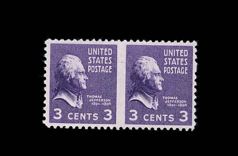 893 og/nhbl 832a image#832a, $1.00 Purple and black, vertical pair, imperforate horizontally, an exceptionally handsome bottom sheet-margin block of four containing two error pairs, wonderfully fresh, outstanding centering and margins, pristine o.g., left pair n.h., right pair faintest trace of hinging (if at all), faint position numbers in pencil on reverse, extremely fine; only 50 pairs of this important error were ever found; an essential showpiece for the exhibitor of the 1938 Presidential series; 1982 PF certificate; ex-Hewitt. (Image) 3,200.00+