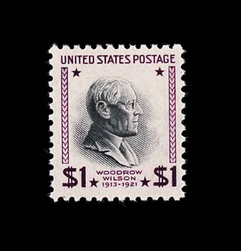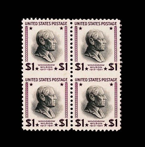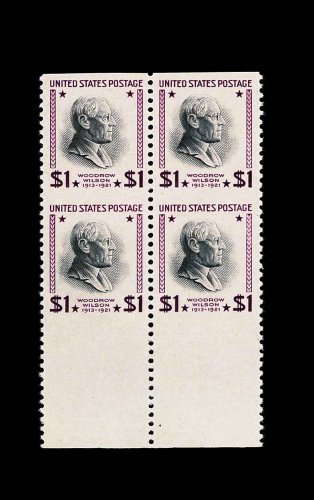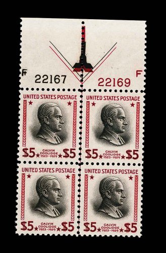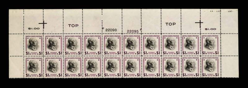 895 nhX 832b image#832b, $1.00 Purple and black, watermarked "USIR" in error, a most impressive full top margin double "TOP", markers and plate nos. F22098, F22095 block of twenty, being the two top rows of the sheet, each stamp exceptionally well centered and margined, very fresh, o.g., n.h. (one stamp not in plate block proper with tiny bit of gum disturbance), very fine - extremely fine; an important Presidential series rarity, perfect for a medal-winning exhibit. (Image) 5,150.00+