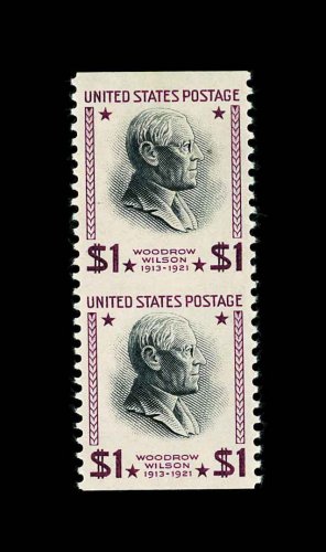 896 nh 832d image#832d, $1.00 Red violet and black, 1954 printing, vertical pair, imperforate horizontally, exceptionally well centered within large margins, o.g., n.h., extremely fine; actually offered less frequently than its first printing counterpart; tiny owner's handstamp at bottom and accompanied by a 1971 PF certificate; ex-Sheriff. (Image) 1,250.00
