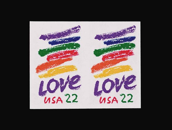 941 nh 2143a image#2143a, 22c Love, imperforate, horizontal pair, well margined, bright and fresh, o.g., n.h., extremely fine; according to Datz only 15 fully imperforate pairs exist, several of which have faults, however this pair is totally fault free. (Image) 1,500.00