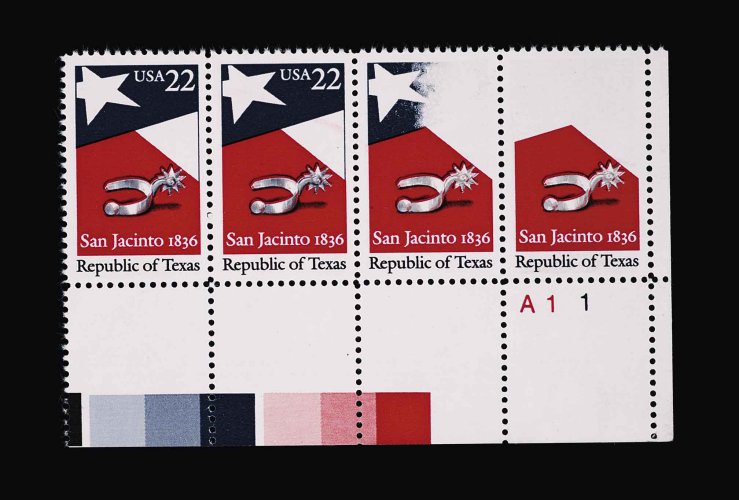 942 nh 2204c image#2204c, 22c Republic of Texas, dark gray blue omitted, an extraordinary transitional error plate number A111 strip of four, from the bottom right corner of the unique sheet which produced this visually stunning missing color error, only two stamps from this sheet have the dark gray blue color completely missing (there are three others with partially omitted colors), first two stamps in the strip are normal, the third stamp with partially omitted color and the fourth stamp being the error, pristine o.g., n.h., extremely fine; one of the premier missing color rarities in all of United States philately; photocopy of a 1995 PF certificate for the sheet from which this strip was taken. (Image) 8,500.00+