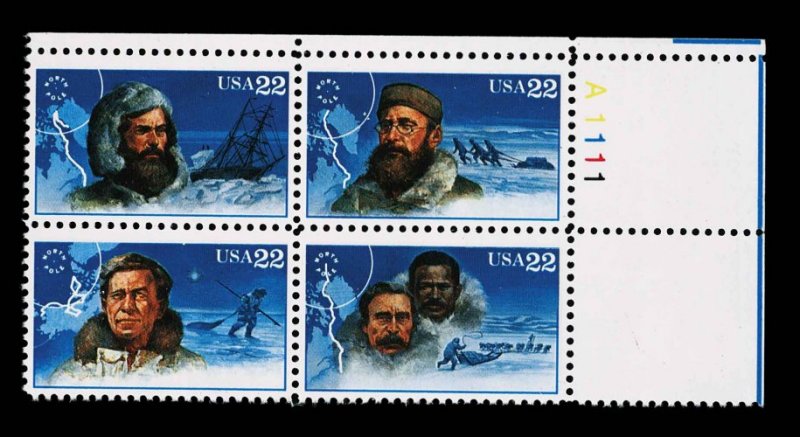 943 nhbl 2223b image#2223b, 22c Arctic Explorers se-tenant block of four, black (engraved) color omitted, a wonderful top right corner margin plate no. A1111 plate block of this incredibly rare missing color error, one of only four such error se-tenant blocks known, with this being the unique plate block, exceptionally bright and fresh, well centered, o.g., n.h., extremely fine; a highly important missing color error from the modern era; 1997 PF certificate. (Image) 9,500.00+