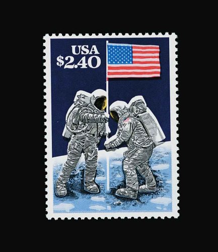 946 nh 2419c image#2419c, $2.40 Moon Landing 20th Anniversary, black lithography color omitted, well centered, unblemished o.g., n.h., very fine; an extremely rare missing color error as only 20 to 30 are known, four of which are in the unique plate block; 1994 PF certificate. (Image) 4,500.00