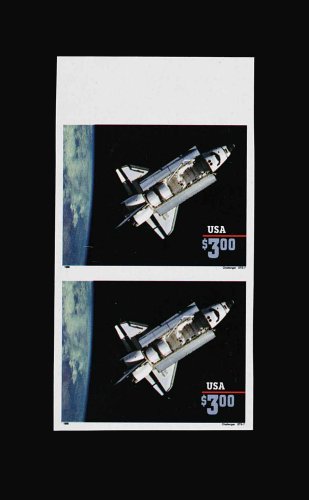 948 nh 2544b image#2544b, $3.00 Space Shuttle, imperforate, top sheet-margin vertical pair, large perfectly balanced margins, o.g., n.h., extremely fine; according to Datz, this newly reported error pair exists only in a quantity of three to four, he further explains "Two panes (were) initially reported. Each contained varying degrees of blind perfs. One pane yielded two error pairs, the second pane, one or two error pairs. Expert certificate essential."; this pair is accompanied by a newly obtained 2001 PF certificate. (Image) Est. 4,000-5,000