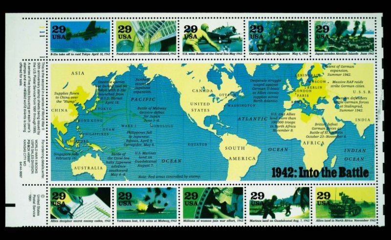 949 nh 2697k image#2697k, 29c World War II se-tenant block of ten, red lithography color omitted, upper left plate no. 1111 example, this being one of only two examples known, coming from a complete pane of two blocks of ten each which yielded the only errors ever to be found, pristine o.g., n.h., extremely fine; a highly desirable and striking missing color error; 1994 PSE certificate; ex-Weisman. (Image) 10,000.00