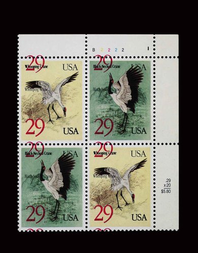 952 nhbl 2868c image#2868c, 29c Cranes se-tenant block of four, double impressions of intaglio black color and red denominations, an extraordinary double error of extreme rarity and eye appeal, being a top right corner sheet-margin example, all stamps with double impression of crane names (intaglio black), plus all stamps doubled red "29" denominations (split at top and bottom), well centered, o.g., n.h., light fingerprinting on gum, extremely fine; this stunning error block is from the unique discovery sheet of 20, however only 15 of the stamps on the sheet displayed the double error, and of these there are only two intact se-tenant blocks of four, the remaining seven stamps are stray singles; one of the most unusual modern errors and certainly one of the rarest; 1999 PF certificate for the sheet. (Image) Est. 5,000-7,500