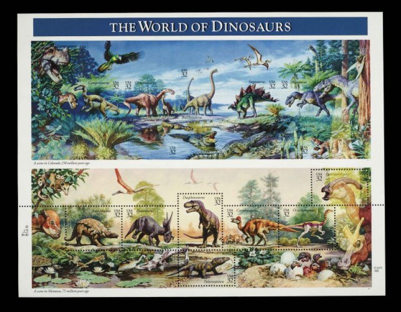 954 nh 3136 var. image#3136 var., 32c "World of Dinosaurs" pane of fifteen, top seven stamps imperforate, a pristine mint example of this visually striking and very rare error of which only three are recorded, according to the latest edition of the Datz catalog, pane also displays interesting printing "wipe" to design at right which eliminated some of the colors, o.g., n.h., extremely fine; the Scott catalog currently only lists the error with the bottom half imperforate (#3136p); the catalog value quoted in Datz is for the last reported sale at auction in January 2000, where this pane realized $6,250.00, plus the 10% buyer's premium. (Image) Datz 6,875.00