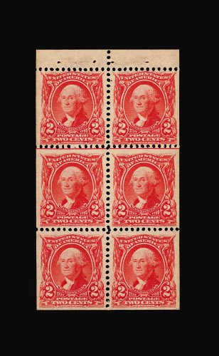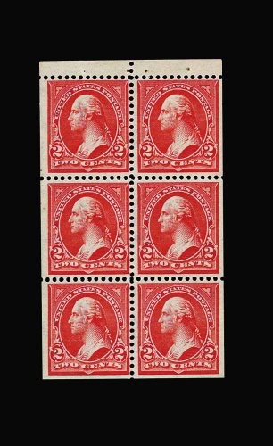 960 nhK 301c image#301c, 2c Carmine booklet pane of six, position E, showing horizontal guide line between first and second row, brilliantly fresh, strong and intact perforations, exceptionally well centered for this, pristine o.g., n.h., choice very fine; a premium example of this scarce pane and position. (Image) 800.00+
