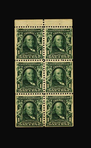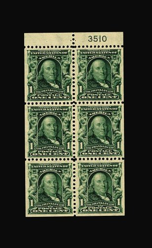959 nhK 300b image#300b, 1c Blue green booklet pane of six, position D, a remarkable quality pane showing plate no. 3510 in the selvage tab, only one position on the entire 180-subject sheet contained the plate number, with this particular example being in incredible condition, featuring outstanding centering and margins throughout, wonderfully fresh and crisp, o.g., n.h., extremely fine; the only gem example of this rare pane we have ever seen; 1999 PF certificate. (Image) 2,100.00