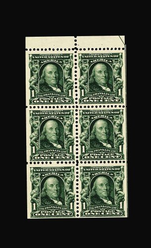 958 nhK 300b image#300b, 1c Blue green booklet pane of six, position B, an incredibly choice example of this rare position which shows a guide arrow in the top right corner of the sheet selvage tab, as well as a guide line at right, a highly desirable and collectable position (#5) which occurs only once on the 180-subject plate, spectacularly intense color on brilliantly white paper, wonderfully well centered, o.g., n.h., extremely fine; rare in any quality, but particularly so in this premium condition; 1999 PF certificate. (Image) Est. 1,500-2,000