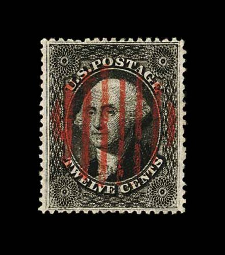 100 O 36b image#36b, 12c Black, plate III, the used single offered here is clearly one of the most spectacular, in terms of its overall quality, that one will ever encounter, as this extraordinary stamp features flawless centering which is almost unheard of on this perpetually difficult value, plus its margins are considerably wider than usually found, even its color is especially intense which is marvelously accented by a perfect strike of a rimless grid in deep red, plus it displays the double frame line at left variety, an extremely fine used gem for the perfectionist; 1995 PF certificate. (Image) 200.00+