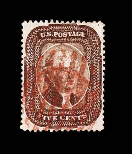 83 O 28A image#28A, 5c Indian red, Ty. I, a spectacular used example of this very rare stamp, being in a quality that would be difficult to locate, as it possesses essentially perfect centering amid unusually wide margins, with its perforations clearing the design projections all around, and equally impressive is this stamp's remarkably intense and unmistakable Indian red color, plus its impression is richly inked on bright fresh paper, fully intact and even perforations all around, neat portions of black town c.d.s. and a red transit c.d.s., an extremely fine gem that is among the very finest used examples available; 1991 PF certificate. (Image) 3,075.00