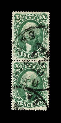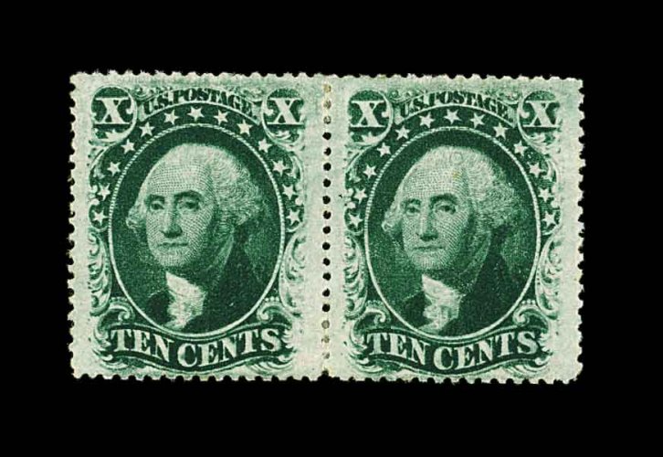 90 O 33, 32 image#33, 32, 10c Green, Ty. II and III combination pair, vertical pair, each stamp being incredibly well centered within margins that are much larger than typically encountered on this value, strong rich color and clean crisp impression, central New Orleans c.d.s., extremely fine; the finest centered example of this scarce combination pair we have ever seen; 1989 PF certificate; ex-Koppersmith. (Image) 575.00