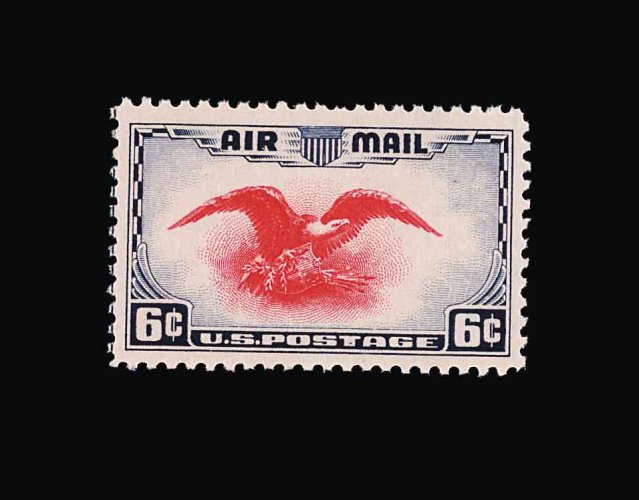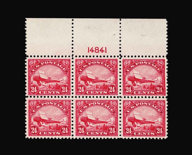 1022 nhX C6 image#C6, 24c Carmine, a magnificent full top margin plate no. 14841 block of six, brilliantly fresh, stunningly rich color and impression on bright paper, outstanding centering, unblemished o.g., never hinged, an extremely fine plate block in every regard; one of the finest quality full top Twenty-Four Cent 1923 Air Post plate blocks available. (Image) 3,500.00