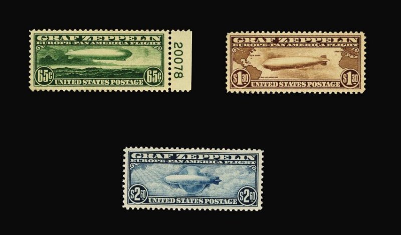 1023 nh C13-15 image#C13-15, 65c-$2.60 Graf Zeppelins cplt., handsome well-matched set of mint singles, each well centered with strong fresh colors, o.g., n.h., extremely fine; $2.60 accompanied by a 1974 PF certificate. (Image) 2,235.00