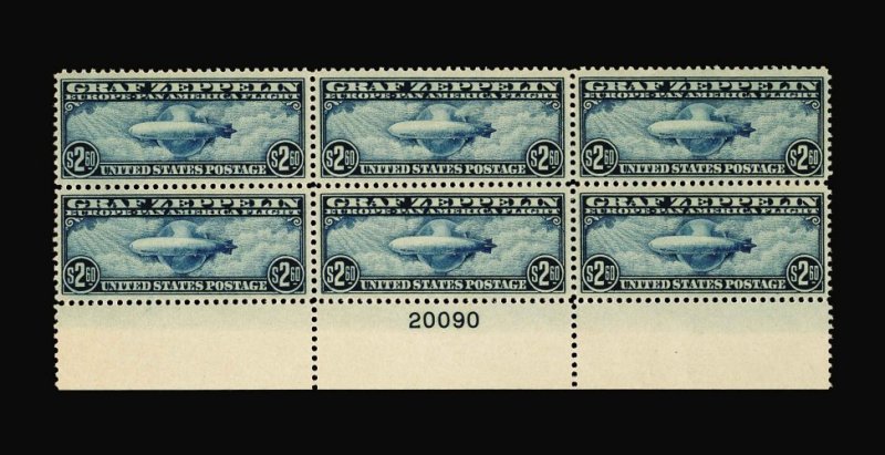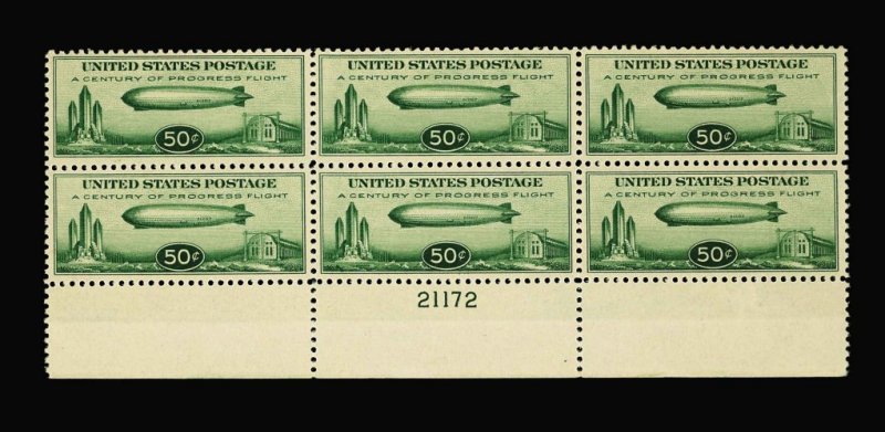 1025 nhX C18 image#C18, 50c Graf Zeppelin, full bottom margin plate no. 21172 block of six, quite fresh, o.g., n.h., very fine. (Image) 775.00