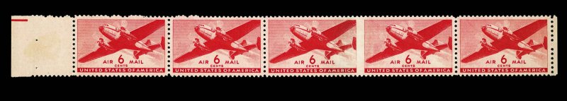 1029 nh C25b image#C25b, 6c Carmine red, horizontal pair, imperforate between, the error pair being the third and fourth stamps in a horizontal strip of five (the complete row), well centered, fresh, o.g., all n.h. except one non-error stamp, error pair with faint characteristic P.O. crayon rejection mark, very fine; a choice example of this very rare error, with only twenty pairs known. (Image) 1,750.00+