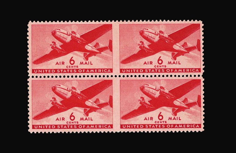 1030 nhbl C25b image#C25b, 6c Carmine red, horizontal pair, imperforate between, an extraordinarily rare mint block of four containing two error pairs, but even more impressive is that both pairs are without the usual crayon Post Office rejection marks, bright and fresh, o.g., n.h., extremely fine; only twenty pairs exist, and few of these are known without the crayon markings, almost certainly unique as a block; 1990 PF certificate. (Image) 4,500.00+