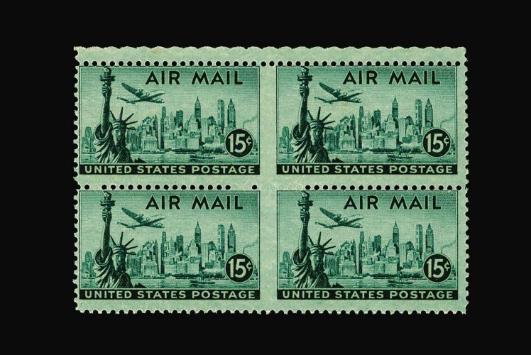 1031 nhbl C35a image#C35a, 15c Statue of Liberty, horizontal pair, imperforate between, a very rare block of four containing two of the twenty pairs known, wonderfully fresh, centered a bit to top left as are all known examples, o.g., n.h., fine; an impressive air post rarity showpiece. (Image) 4,200.00+