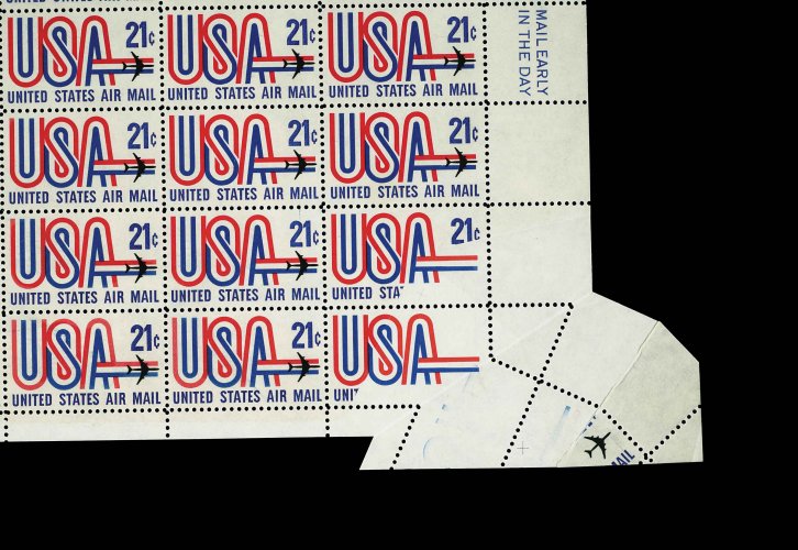 1032 nhbl C81 var. image#C81 var., 21c "USA" and Jet, black (engraved) color omitted, a most remarkable complete sheet of fifty, where a significant foldover in the bottom right corner caused the position 45 stamp to be the black color omitted error, while the position 50 stamp, which displays an enormous and freakish foldover, has the black color printed on the gummed side and is omitted from the front, the remaining stamps in the sheet are normal, o.g., n.h., very fine; this unique sheet produced the sole known examples of each major error; an important modern error rarity and a marvelous showpiece for the air post specialist as well; unlisted in Scott, however the Datz catalog does price the intact sheet at $12,100.00, which is the price this sheet realized in a November 1997 auction ($11,000.00, plus the buyer's premium); 2001 PF certificate (Image) Est. 7,500-10,000