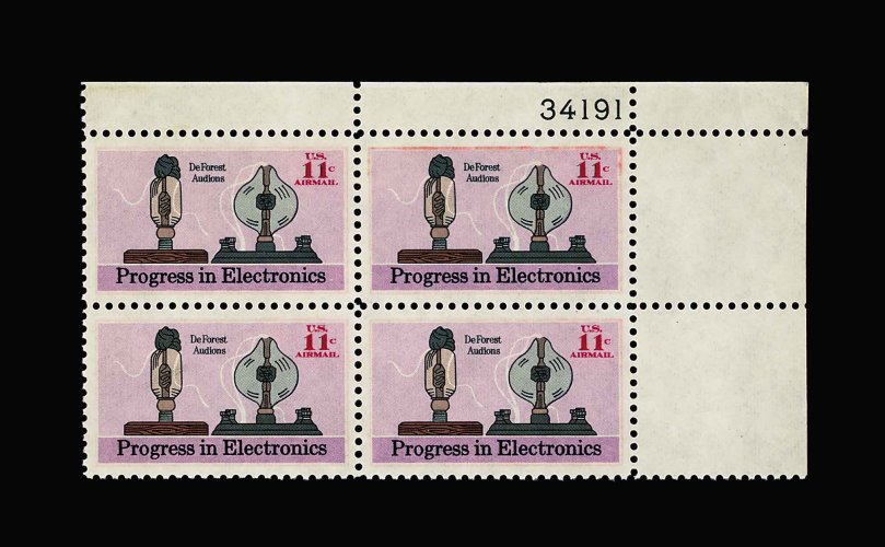 1033 nhX C86c image#C86c, 11c Progress in Electronics, olive color omitted, top right corner plate no. 34191 block of four, this discovery plate block contains the only four examples known of the olive color omitted error, the stamps also only have partial or faint traces of the vermilion color, well centered, o.g., n.h., extremely fine; an enormously rare color missing error that is listed in both Scott and Datz, however neither catalog has yet attempted to value it; 1998 PF certificate. (Image) Est. 7,500-10,000
