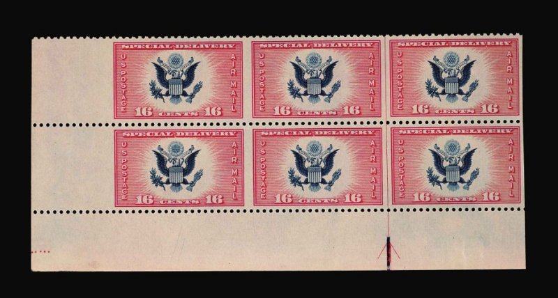 1035 og/nhbl CE2a image#CE2a, 16c Red and blue Air Post Special Delivery, imperforate vertically, bottom left corner sheet-margin block of six (3 x 2), with vertical guide line and arrow, brilliantly fresh, o.g., n.h. except a couple of stamps in bottom row, extremely fine; the unique arrow block from the only known sheet which produced a mere ten error pairs; the Scott catalog prices two pairs alone at $8,000.00; a magnificent showpiece of the highest rarity; ex-Matthews and "Aurea" Collection. (Image) Est. 7,500-10,000