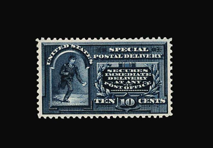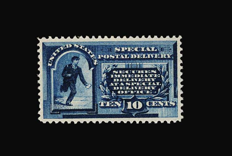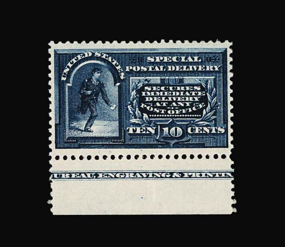 1037 nh E2 image#E2, 10c Blue, pristine mint example, lovely rich color and a crisp impression on bright paper, extraordinarily well centered within large margins, unblemished o.g., n.h., extremely fine; a very scarce stamp both in this premium condition and never hinged; 1982 PF certificate. (Image) 550.00