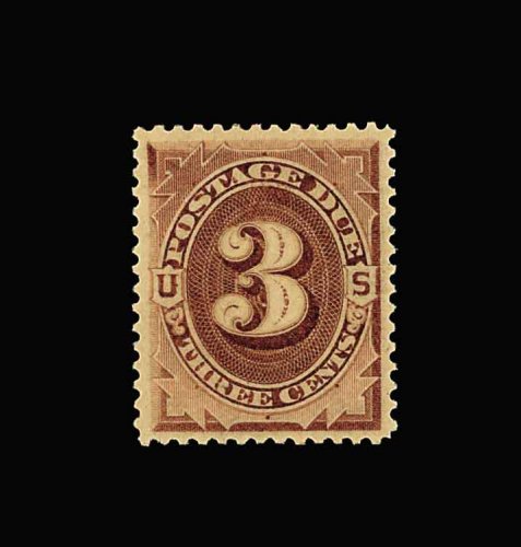 1061 og J3 image#J3, 3c Brown, flawlessly centered within uncharacteristically large margins, bright color and a crisp impression, o.g., l.h., extremely fine and choice. (Image) 52.50