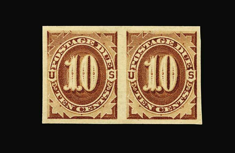1064 og J5a image#J5a, 10c Brown, imperforate, a gem horizontal pair of this rare imperforate variety of which no more than 23 pairs exist, large even margins all around, extraordinarily fresh and crisp, rich color, o.g., lightly hinged, extremely fine; incredibly rare, especially in this premium quality, as most of these imperforates are found with faults; 1991 PF certificate for a block of four from which this pair was taken, plus a 1992 PSE certificate as a pair; ex-Weisman. (Image) 2,000.00