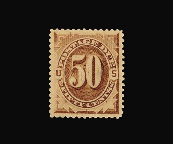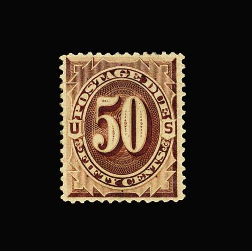 1072 og J14 image#J14, 50c Deep brown special printing, an exceedingly rare mint example of this, in a quality that is seldom seen, being quite fresh and choice, free from the many faults often associated with these challenging issues, wonderfully well centered, rich color, full o.g., appropriately graded extremely fine relative to the other known examples, of which only 179 were thought to have reached the public; 1968 and 1995 PF certificates. (Image) 3,750.00