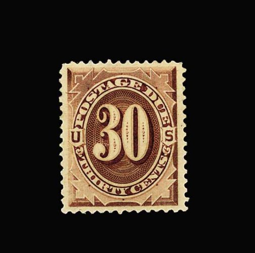 1071 og J13 image#J13, 30c Deep brown special printing, an incomparable quality mint example of this very rare stamp, magnificently centered amid unusually large margins, gorgeous color and a crisp detailed impression on bright paper, full clean o.g., lightly hinged, extremely fine; unquestionably one of the finest, if not the finest, Ten Cent Postage Due Special Printings in existence; it is believed that only 179 of this value ever reached the public; 1992 PF certificate; ex-Zoellner. (Image) 3,750.00