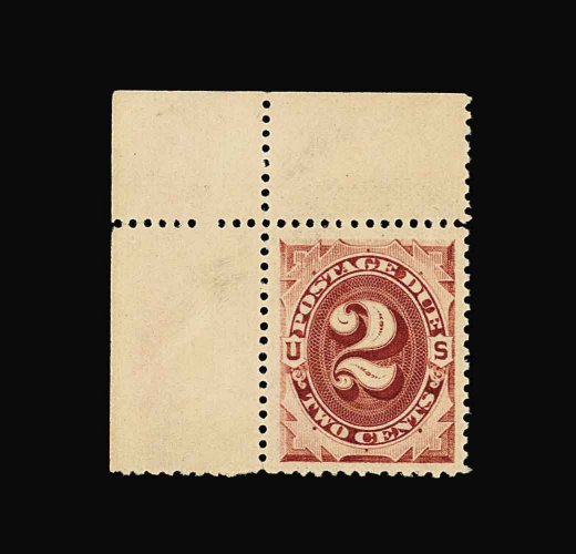 1075 nh J16 image#J16, 2c Red brown, a phenomenal top left corner sheet-margin mint single, in a quality unlike any other we have seen, possessing huge margins all around and being perfectly well centered within them, lovely rich color, o.g., n.h., extremely fine; an amazing gem. (Image) 67.50