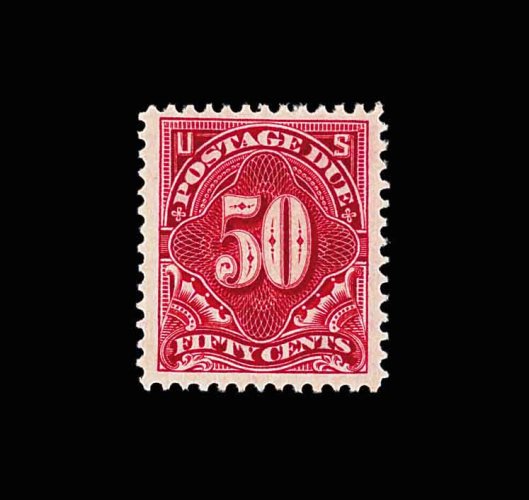 1121 og J50 image#J50, 50c Deep claret, an extraordinary mint example of this key value, possessing lavishly large margins and being wonderfully well centered within them, additionally this stamp's color is remarkably intense and its impression prooflike on bright fresh paper, o.g., lightly hinged, extremely fine and handsome; 1993 PF certificate. (Image) 950.00