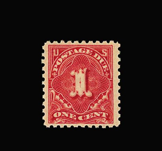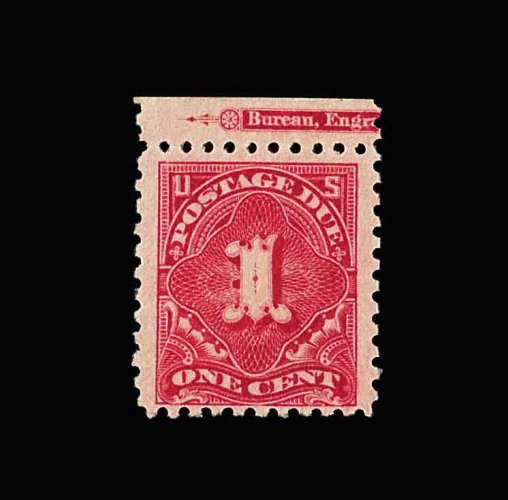 1134 nh J59 image#J59, 1c Rose, an extraordinarily rare "post office" fresh top sheet-margin partial imprint single of this truly rare postage due, possessing an overall brilliance and freshness like few others, lovely rich color, wide margins on three sides, slightly centered to bottom, pristine o.g., never hinged, very fine; the rarity of this stamp in premium never hinged condition cannot be overstated, and as testimony to its desirability, this stamp realized $7,700.00 (including premium) when it was last sold at auction in 1998; 1980 PF certificate; ex-Handy and Zoellner. (Image) 4,400.00