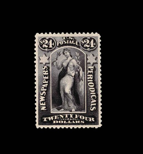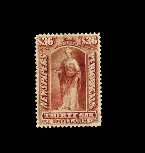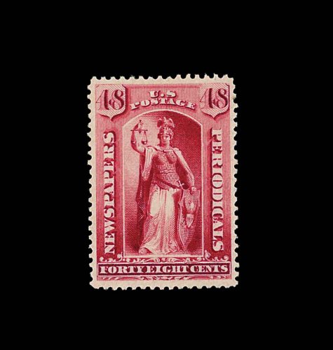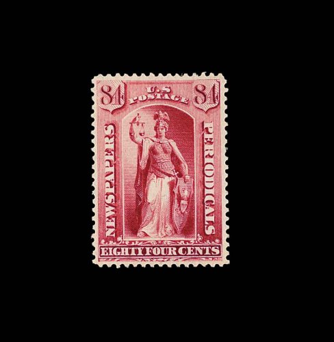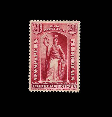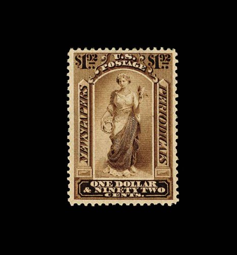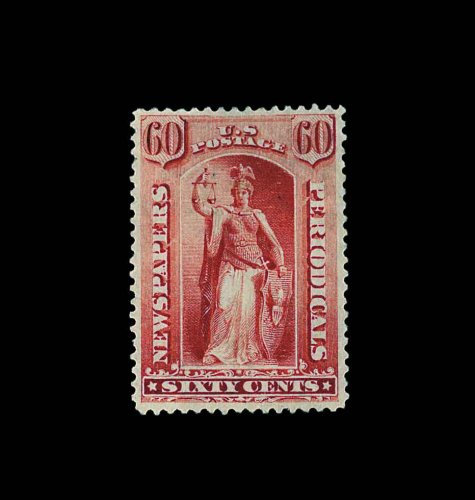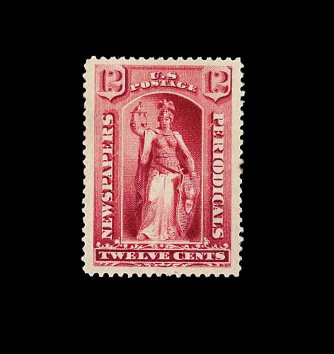 1209 og PR76 image#PR76, $24.00 Dark violet, an incredibly choice mint single, possessing outstanding freshness and gorgeous rich color, flawlessly centered amid uncharacteristically large margins, full o.g., extremely fine; newspaper stamps rarely come in this gem quality; 1997 PF certificate. (Image) 600.00