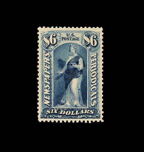 1207 nh PR73 image#PR73, $6.00 Blue, an extraordinarily handsome mint example, being in a remarkable state of preservation, featuring outstanding centering amid large margins, sumptuously rich color and crisp impression, unblemished o.g., never hinged (especially scarce thus), small natural gum inclusion spot, extremely fine; 1997 PSE certificate. (Image) for hinged 500.00