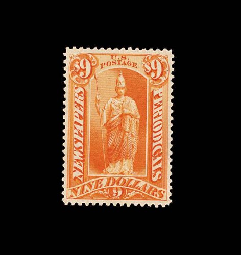 1208 og PR74 image#PR74, $9.00 Orange, a fabulous gem mint example, being in a quality that is next to perfection for any stamp, let alone a difficult newspaper stamp, possessing a remarkable overall brilliance and freshness, with absolutely radiant color and a prooflike impression on bright paper, flawlessly centered within large margins, unusually even and intact perforations all around, immaculate full o.g. with just the barest suggestion of a hinge mark, extremely fine; an incredibly beautiful stamp; 1984 PF certificate. (Image) 375.00