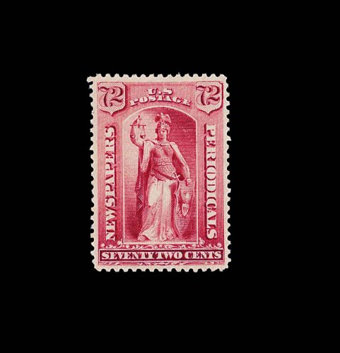 1219 nh PR87 image#PR87, 72c Carmine, an incredibly fresh and choice mint example of this value, in a quality which few newspaper stamps can be found, with lovely bright color and impression on immaculate paper, extraordinarily well centered within uncommonly large margins, pristine o.g., never hinged, extremely fine; a true gem; 1997 PF certificate. (Image) for hinged 200.00