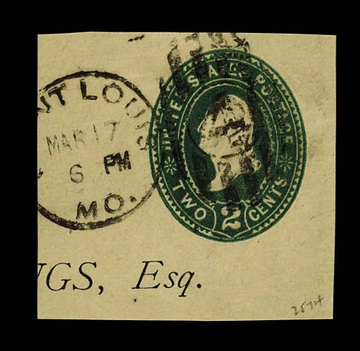 1402 O U309 image#U309, 2c Green on manila, choice used cut square, 47x45mm, especially scarce and desirable this large, neat St. Louis, Mo. duplex cancel, extremely fine; 1992 PSE certificate; ex-Lyons. (Image) 725.00