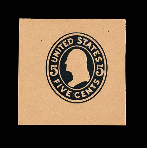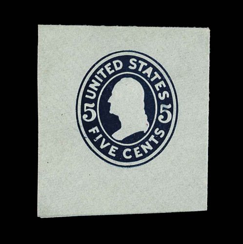 1415 og U418c image#U418c, 5c Blue, printed on blue in error instead of white, die 2, choice mint cut square, being a highly desirable full corner measuring 42x47mm, wonderfully fresh and bright, extremely fine; a very rare cut square, as no entires are known. (Image) 2,000.00