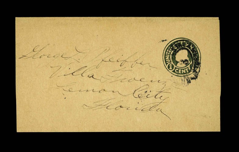 1419 Oc W427 var. image#W427 var., 1c Green on unglazed (on both sides) brown wrapper, knife W9, wmk. 0, used entire with double oval New York postmark, addressed to Lemon City, Fla., tiny edge tear on folded back, very fine; an extremely rare and quite possibly unique entire as it is unlisted in Scott and only listed as mint in the UPSS catalog; accompanied by two notes from William H. Maisel which state that the catalog listing is based on this item; 2000 PF certificate (UPSS #2141). (Image) for mint 3,000.00