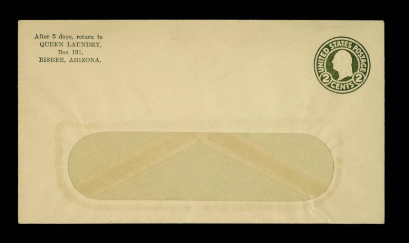 1420 ogc U429i image#U429i, 2c Green on white, error of color, die 1, UPSS die 134(A), size 13, knife 80w, wmk. 26, mint entire, with usual "Queen Laundry/Bisbee, Arizona" printed corner card and address window at bottom, exceptionally fresh and clean, extremely fine; an immensely rare 20th century envelope, with only six copies believed to exist (UPSS #2242). (Image) 12,500.00