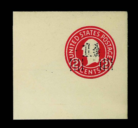 1482 ogc U504 image#U504, 1 1/2c on 2c Carmine on blue, die 1, UPSS die 134(A), size 10, knife 59, wmk. 25, mint entire which is unlisted with UPSS in this specific smaller size 10 and die type, fresh and very fine; quite possibly unique (UPSS unlisted). (Image) 500.00+